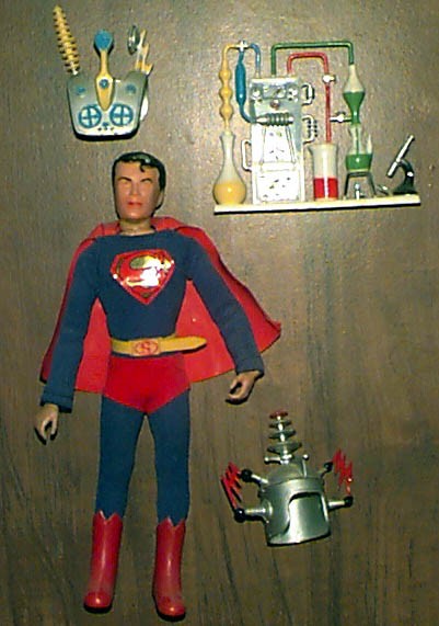 - Suit - Blue with Red shorts, one piece with attached red vinyl cape with slit in the back. “S” emblem is metal and is the same as the Superman emblem